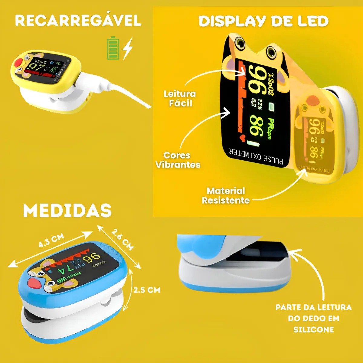 O Oxímetro Pediátrico foi desenvolvido para oferecer praticidade e precisão na medição da saturação de oxigênio no sangue (SpO₂%) e da frequência cardíaca (BPM) de forma não invasiva.